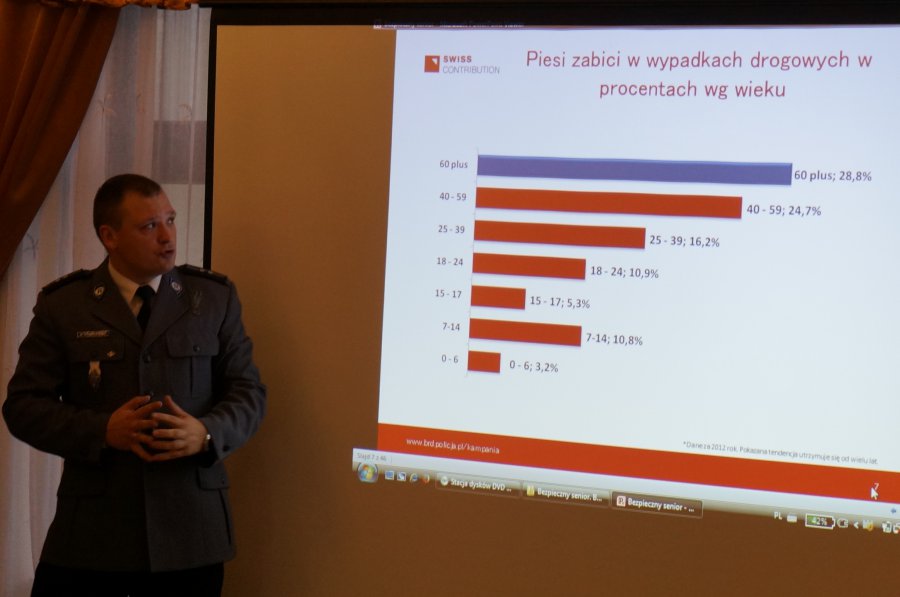 W trakcie spotkania asp. Krzysztof Stankiewicz z Wydziału Ruchu Drogowego Komendy Miejskiej Policji w Bielsku-Białej przedstawił prezentację pt. "Senior w ruchu drogowym", podczas której omówił główne przyczyny powstawania zdarzeń drogowych z udziałem osób starszych oraz sposoby unikania zagrożeń i niebezpieczeństw, mogących wystąpić na drodze. Mówił także o problemie widoczności na drodze i konieczności używania elementów odblaskowych, które znacząco wpływają na bezpieczeństwo pieszych.