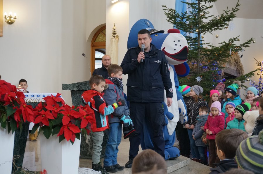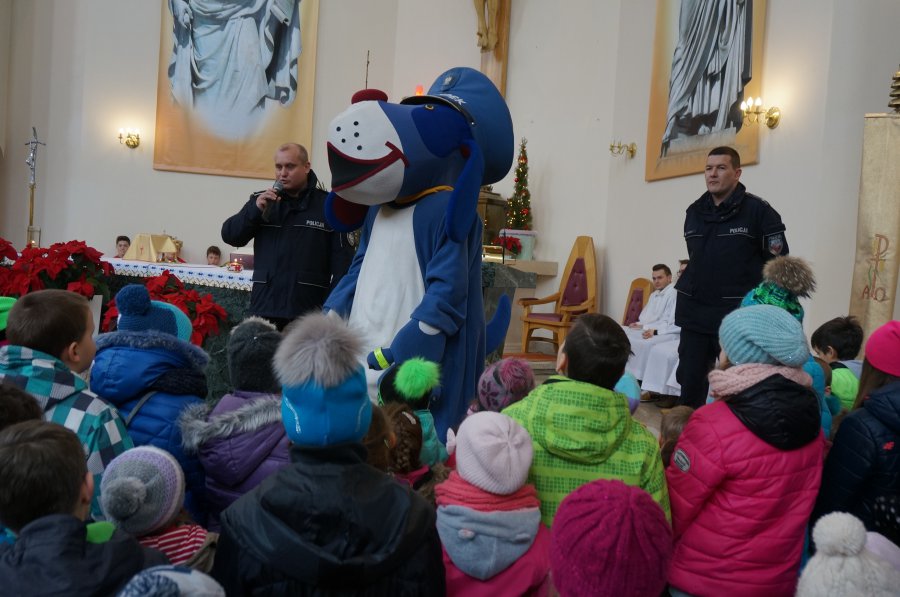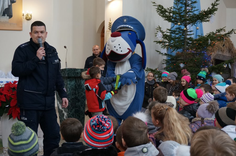 Policjanci i Sznupek rozdawali odblaski w kościele
