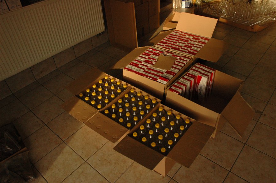 Policjanci zatrzymali 42-latka do kontroli drogowej. W jego samochodzie odnaleźli prawie 500 litrów spirytusu bez polskich znaków akcyzy. Podczas przeszukania jego posesji, w jednej z miejscowości powiatu bielskiego, śledczy zabezpieczyli kolejne nielegalne wyroby: 23 tysiące sztuk papierosów, 68 kg tytoniu oraz ponad 100 litrów spirytusu. Wprowadzenie do obrotu zabezpieczonej kontrabandy naraziłoby Skarb Państwa na ponad 100 tys. straty. Ponadto policjanci zabezpieczyli 32 tys. koron czeskich, pochodzących najprawdopodobniej z nielegalnego handlu. Zatrzymany mężczyzna usłyszał już zarzuty. Za przestępstwa te grozi mu do 3 lat za kratami i wysoka grzywna.