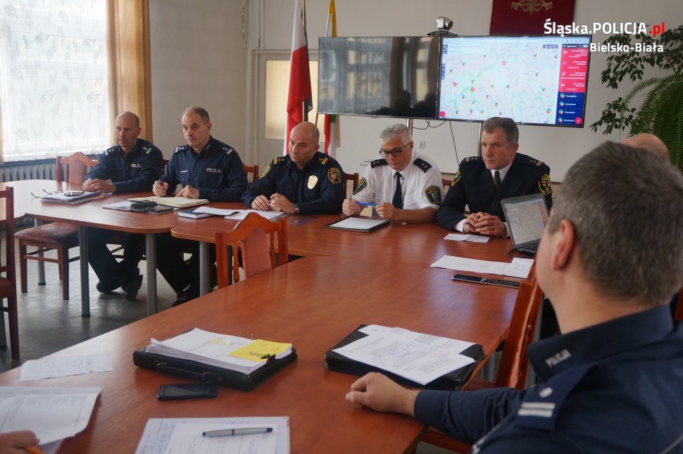 Zaproszonych gości przywitali wiceszefowie bielskiego garnizonu mł. insp. Krzysztof Gałuszka wraz z mł. insp. Grzegorzem Jakubcem. Podczas odprawy komendanci komisariatów omówili stan bezpieczeństwa na terenie miasta i powiatu. Dyskutowano także o wspólnych patrolach, szkoleniach, zabezpieczeniach imprez masowych i wspólnym udziale policjantów i strażników miejskich w akcjach oraz działaniach prewencyjnych. Omówiono funkcjonujące do tej pory zasady stałej wymiany informacji o zagrożeniach występujących na określonym terenie w zakresie bezpieczeństwa, spokoju i porządku publicznego. Poruszono także tematykę koordynowania rozmieszczenia służb policyjnych i straży, z uwzględnieniem zagrożeń występujących na danym terenie. Wspólnego prowadzenia działań porządkowych w celu zapewnienia spokoju i porządku w miejscach zgromadzeń, imprez artystycznych, rozrywkowych i sportowych.