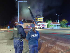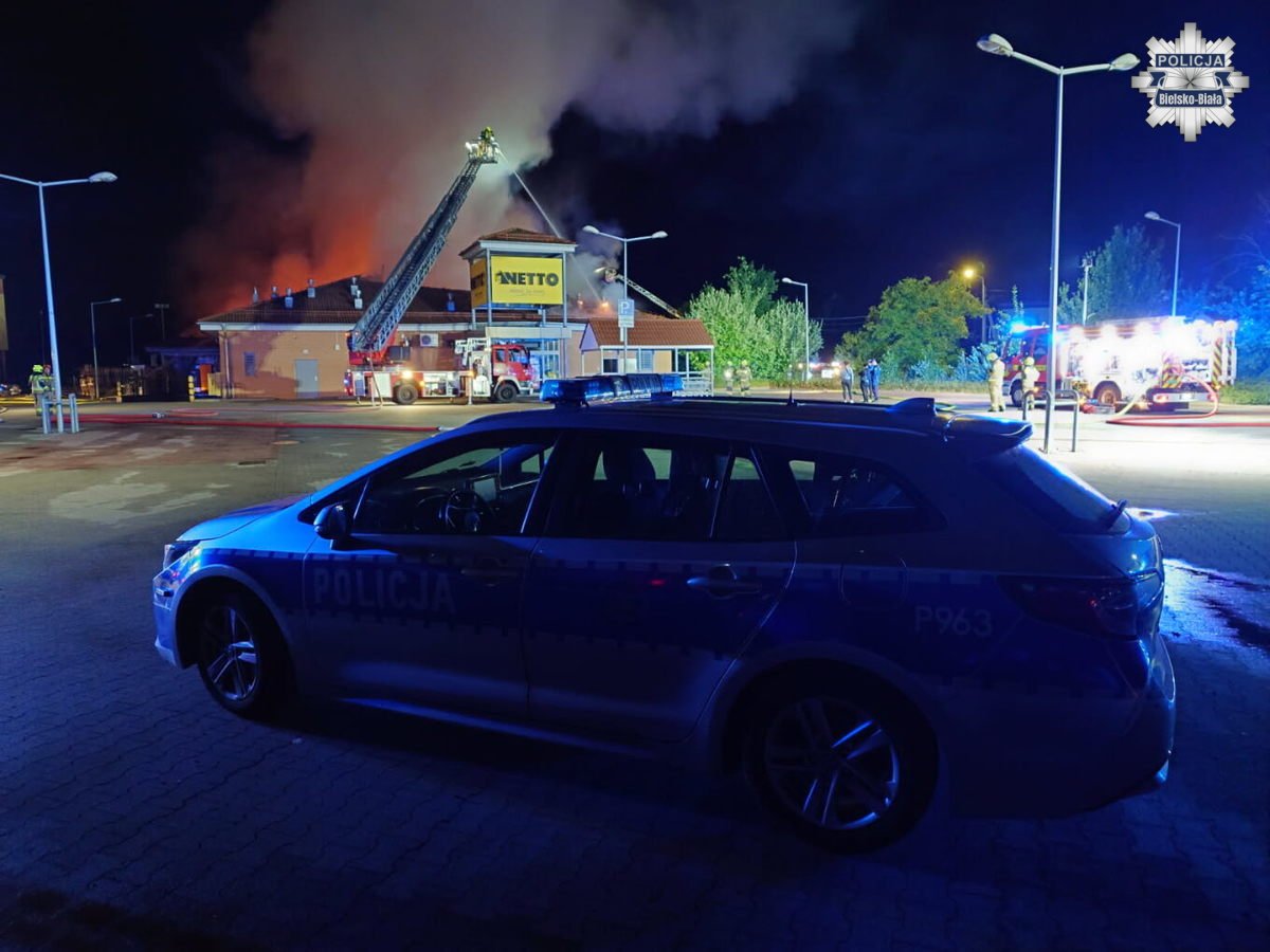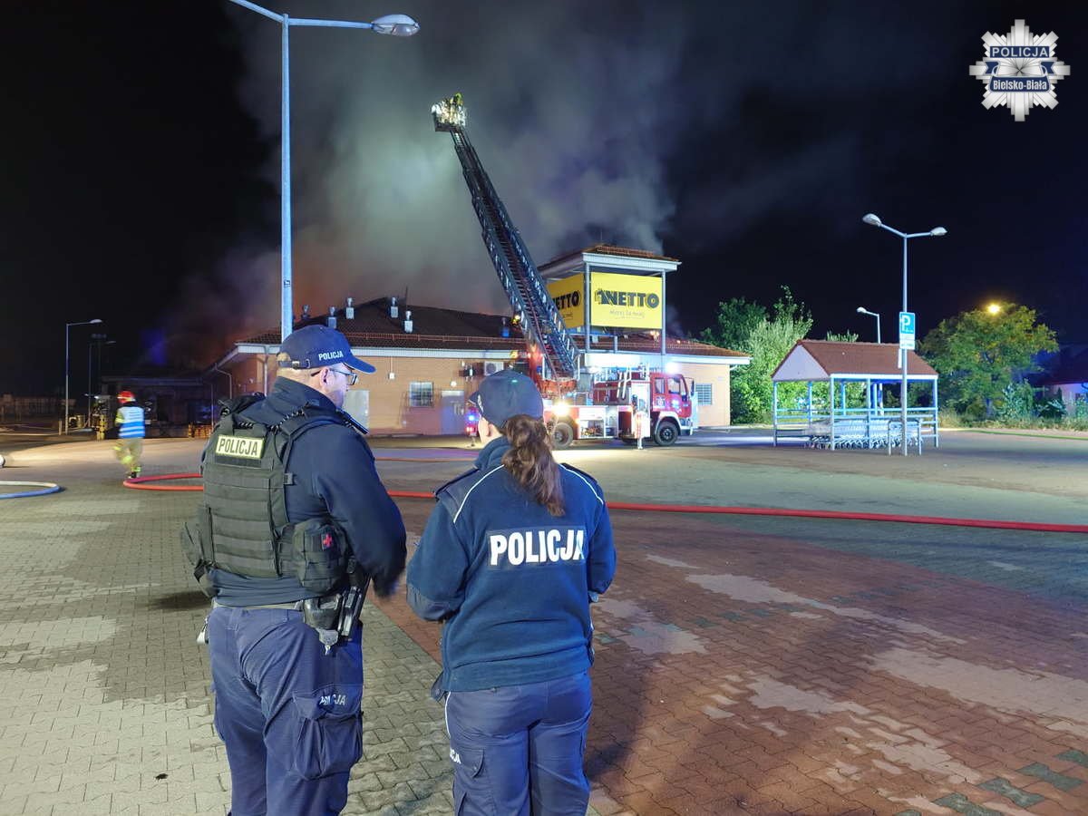 Pożar dyskontu spożywczego w Czechowicach-Dziedzicach – policjanci zabezpieczali miejsce zdarzenia
