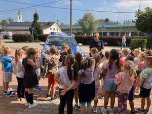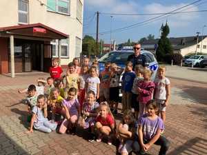 Podczas zajęć policjant przypomniał dzieciom najważniejsze zasady bezpieczeństwa obowiązujące w okresie powrotu dzieci do szkół. To czas, kiedy na drogach można zauważyć wzmożony ruch.