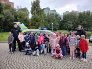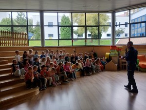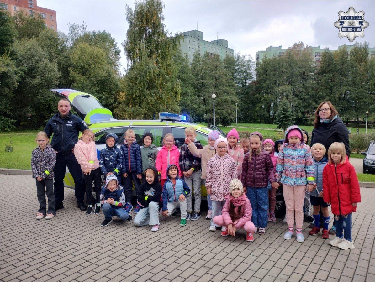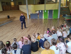 Podczas zajęć policjant przypomniał dzieciom najważniejsze zasady bezpieczeństwa obowiązujące w okresie powrotu dzieci do szkół. To czas, kiedy na drogach można zauważyć wzmożony ruch.