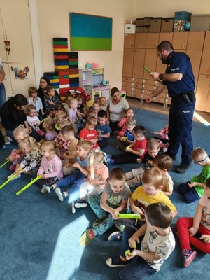 Podczas zajęć policjanci przypomnieli dzieciom najważniejsze zasady bezpieczeństwa obowiązujące w okresie powrotu dzieci do przedszkola. To czas, kiedy na drogach można zauważyć wzmożony ruch.