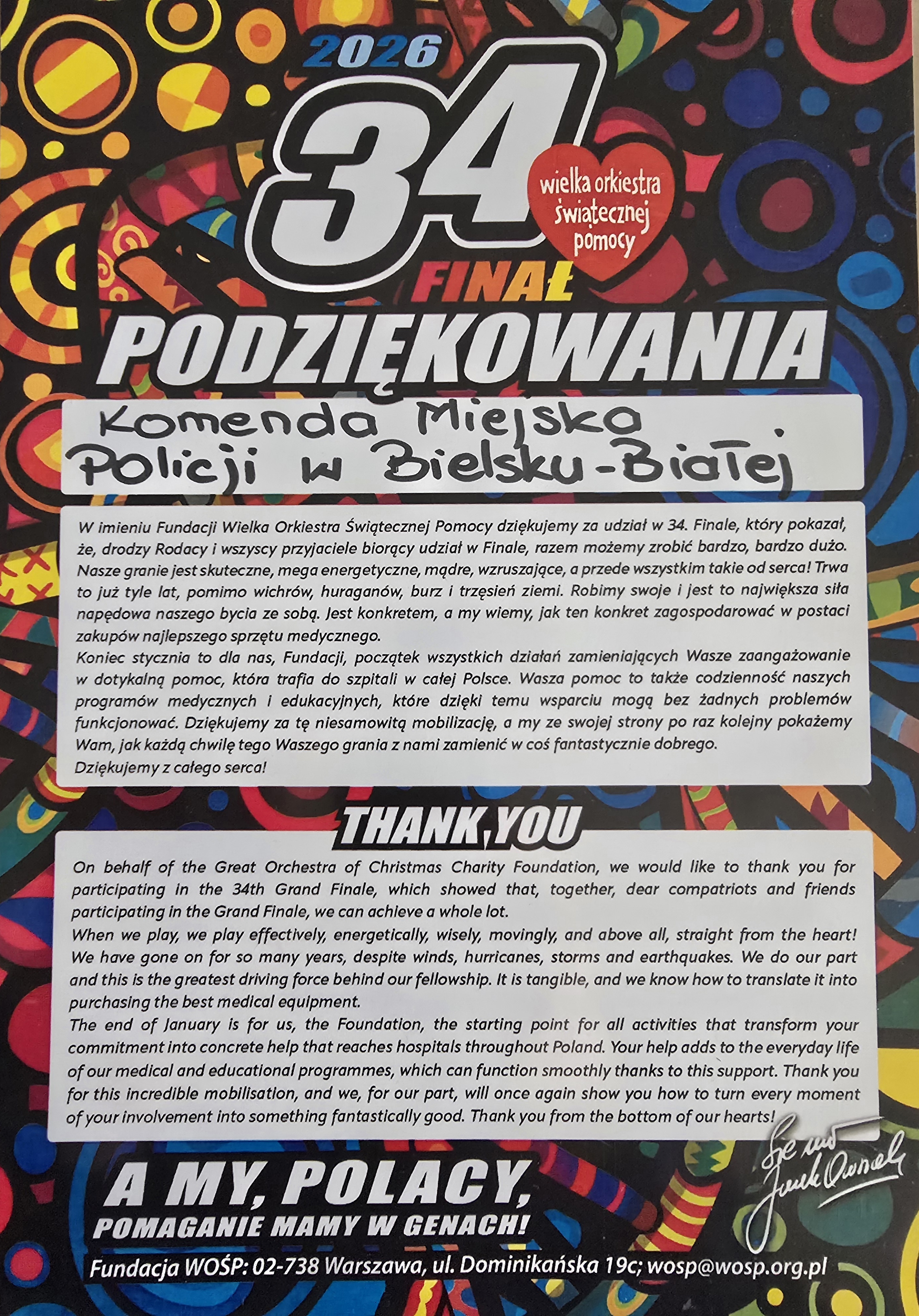 Na ręce Komendanta Miejskiego Policji w Bielsku-Białej wpłynęło oficjalne podziękowanie za profesjonalne zabezpieczenie 34. Finału Wielkiej Orkiestry Świątecznej Pomocy. Wyrazy uznania dotyczą działań podejmowanych przez policjantów bielskiego garnizonu, którzy dbali o bezpieczeństwo uczestników wydarzenia oraz wolontariuszy kwestujących na terenie całego powiatu.