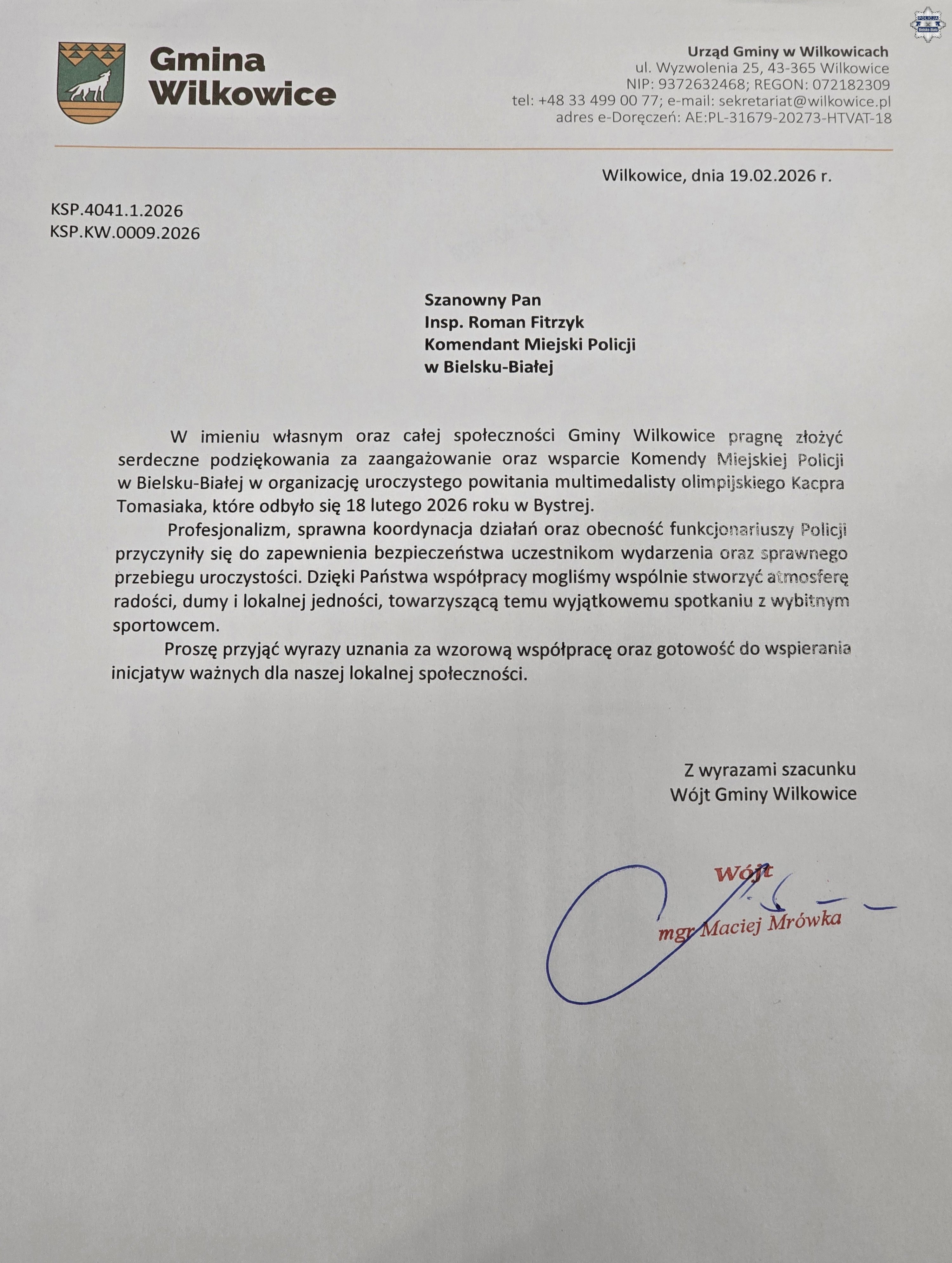 Na ręce Komendanta Miejskiego Policji w Bielsku-Białej wpłynęło podziękowanie od dyrektora Bielskiego Pogotowia Ratunkowego. Wyrazy uznania skierowane zostały do policjantów za pomoc i zaangażowanie w zabezpieczenie XX Międzynarodowych Zimowych Mistrzostw w Ratownictwie Medycznym, które odbyły się pod koniec stycznia w Szczyrku.
