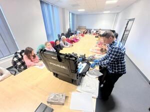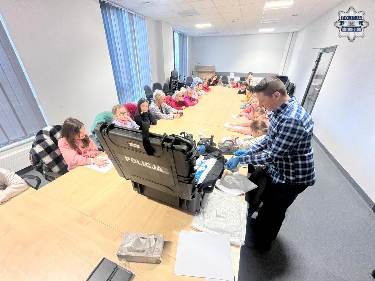 Kolejnym elementem spotkania było zapoznanie się z pracą techników kryminalistyki. Dzieci mogły zobaczyć, w jaki sposób ujawnia się ślady kryminalistyczne, a nawet samodzielnie spróbować swoich sił w ćwiczeniach polegających na ich odnajdywaniu i zabezpieczaniu. Ta część wizyty okazała się niezwykle angażująca i pozwoliła młodym uczestnikom poczuć się przez chwilę jak prawdziwi detektywi.