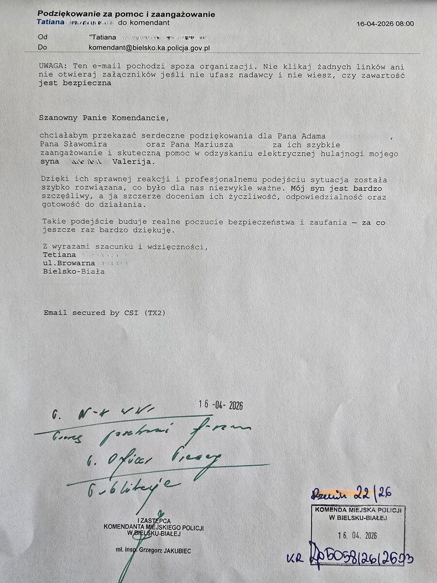 Na ręce Komendanta Miejskiego Policji w Bielsko-Biała wpłynęły podziękowania od pani Tetiany za zaangażowanie oraz skuteczne działania funkcjonariuszy, które doprowadziły do odzyskania skradzionej elektrycznej hulajnogi należącej do jej syna, Valerija.