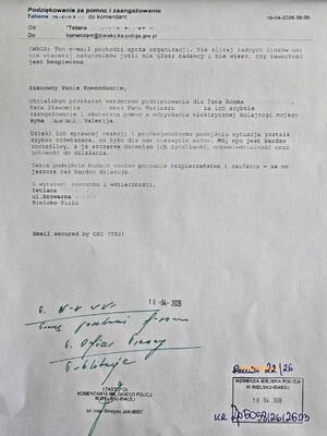 W swoim liście pani Tetiana podkreśliła profesjonalizm, szybkie działanie oraz zaangażowanie bielskich policjantów. Zaznaczyła, że dzięki ich pracy nie tylko odzyskano skradzione mienie, ale również przywrócono poczucie bezpieczeństwa jej rodzinie.