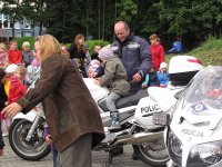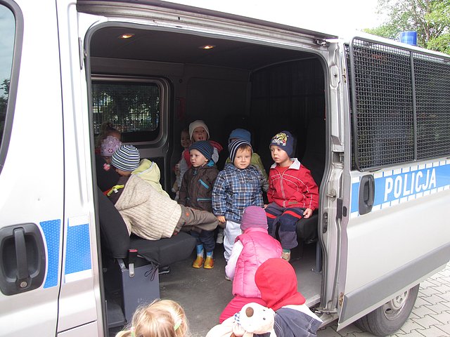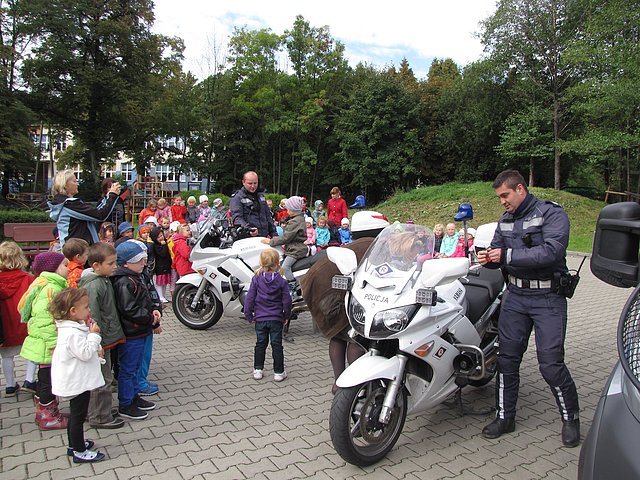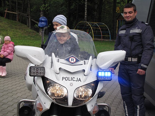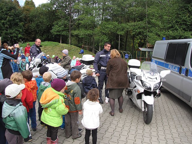 Dzieci wysłuchały porad mundurowych dotyczących właściwego zachowania i unikania zagrożeń w ruchu drogowym. Dowiedziały się jak bezpiecznie zachowywać się na drodze i przez nią przechodzić. Wszyscy mogli zasiąść za kierownicą policyjnego radiowozu czy motocykla, włączyć sygnały dźwiękowe i przymierzyć służbową czapkę. Najmłodsi z uwagą wysłuchali informacji o pracy policjantów. Każdy z maluchów otrzymał elementy odblaskowe, dzięki którym grupa przedszkolaków będzie teraz widoczna z daleka w czasie spacerów wzdłuż drogi.
