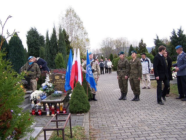 Wczoraj przy grobie policjanta na cmentarzu w bielskiej Kamienicy wystawiono wartę honorową i zapalono znicze, oddając hołd zmarłemu. Podinsp. Bogdan Laskowski zmarł 6 stycznia 2005 roku, na kilka dni przed końcem misji na ciężką postać malarii. Pośmiertnie został awansowany do stopnia podinspektora. Był funkcjonariuszem Wydziału Techniki Operacyjnej, delegatury w Bielsku–Białej. Był doświadczonym policjantem, wcześniej pełnił służbę w kontyngentach policyjnych na terenie byłej Jugosławii.
